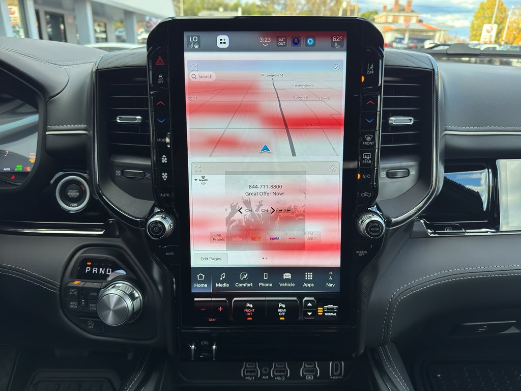 Quick Order Package 22M Limited. Limited Level A Equipment Group: Google Android Auto; SiriusXM Radio Service; USB Host Flip; Surround View Camera System; Integrated Center Stack Radio; LED CHMSL Lamp; Tri-Fold Tonneau Cover; Integrated Voice Command with Bluetooth®; Connectivity - US/Canada; Traffic Sign Recognition; GPS Navigation; 4G LTE Wi-Fi Hot Spot; RamBox Cargo Management System; GPS Antenna Input; Hands-Free Active Driving Assist System; SiriusXM with 360L; Global Telematics Box Module; Head Up Display; Connected Travel and Traffic Services; Evasive Steer Assist; Drowsy Driver Detection; Exterior 115V AC Outlet; Intersection Collision Assist System; Apple CarPlay; Disassociated Touchscreen Display; HD Radio; Smartphone as a Key Capable; 14.4" Touchscreen Display; Uconnect 5 Nav with 14.4" Display; 240 Amp Alternator; Digital Rearview Mirror; 12-Way/1-way Trailer Connector. Night Edition: 285/45R22XL BSW All Season Tires; Accent Color Premium Power Mirrors; Exterior Mirrors with Supplemental Signals; Black Headlamp Bezels; Sport Performance Hood; 22" X 9" Premium Black Aluminum Wheels; Exterior Mirrors Courtesy Lamps; Pirelli Brand Tires; Auto Power-Folding Mirrors; Exterior Mirrors with Heating Element; Auto Dim Exterior Driver Mirror; Black Exterior Truck Badging; Black Day Light Opening Moldings; Accent Color Door Handles; Accent Color Tailgate Handle; Exterior Mirrors with Memory; Dual Exhaust with Black Tips; Body Color Front Bumper; Convex Wide-Angle Exterior Mirror Insert; Black Grille Surround Texture 7 Black; Body Color Rear Bumper with Step Pads; Black Tail Lamp Bezels; RAM Grille Badge - Black; Black Painted Exterior Mirrors Caps. Dual-Pane Panoramic Sunroof. Multi-Function Tailgate. Tri-Fold Tonneau Cover. Trailer Brake Control. Diamond Black Crystal PC. **Equipment listed is based on original vehicle build and subject to change. Please confirm the accuracy of the included equipment by calling the dealer prior to purchase.**